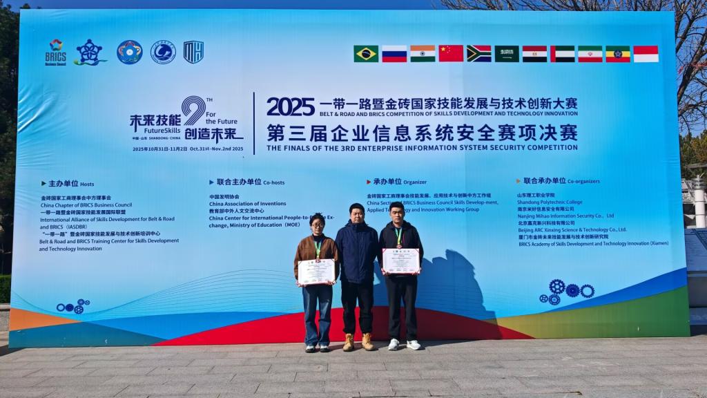 大赛由金砖国家工商理事会中方理事会、“一带一路”暨金砖国家技能发展国际联盟联合主办,对标世赛网络安全职业标准,全面考核企业系统安全运维、应急响应、漏洞挖掘及团队协作等综合能力。备赛期间,两名同学在学院教师左鑫指导下,全力投入集训,最终凭借扎实专业功底和稳定现场发挥斩获佳绩。