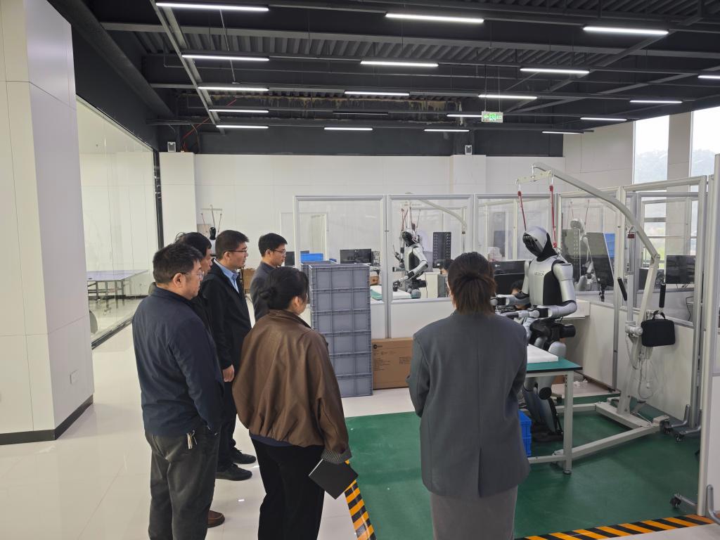 调研伊始,刘鹏总经理带领一行人实地参观了公司机器人训练基地。作为十堰市人工智能产业的重要实训平台,该基地聚焦人形机器人应用场景,刘鹏总经理围绕“人形机器人训练学习”核心,从训练体系搭建逻辑、核心技术训练模块、学习效果评估标准三方面展开详细讲解。他重点演示了人形机器人的步态规划训练、复杂环境感知学习、多关节协同控制训练等关键环节,介绍了基地自主研发的“理论学习-模拟训练-实战考核”三阶训练模式,让调研团队直观感受了人工智能技术与产业融合的前沿动态。