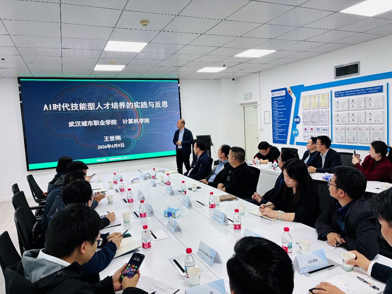 在武汉职业技术学院和武汉城市职业学院,调研组重点考察了人工智能学院(信创产业学院)、鲲鹏产业学院及人工智能实训基地建设情况,深入了解了“岗课赛证”融通、现场工程师培养、产业学院运行机制等典型经验。双方还就人才培养方案动态调整、模块化课程开发、师资队伍建设等议题进行了座谈研讨。